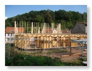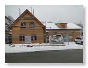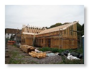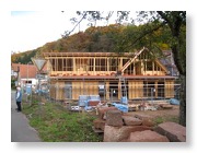 Im Juli 2009 wurde die Bodenplatte gegossen. Im September begann der Aufbau des Holzständerwerks. Schnell war klar, dass die beauftragte Firma in finanziellen Schwierigkeiten war und nicht in der Lage sein würde, dieses Haus jemals fertig zu stellen. Im Mai 2010 mussten sie die Arbeit niederlegen, wir konnten uns aus dem Vertrag lösen und die Dinge endlich selbst in die Hand nehmen. Innerhalb kurzer Zeit stellten wir mit örtlichen Handwerksfirmen das Haus fertig. Am 1.7. 2010 empfingen wir unsere ersten Gäste.
